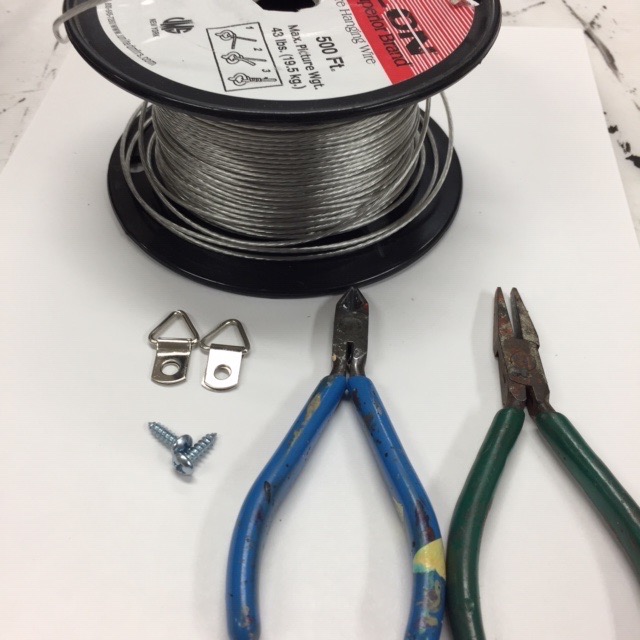 2. Assemble wire cutters, wire, screws, hooks, and crimpers.