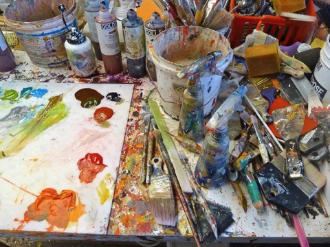 I’m fortunate to have a fairly large space to work in, someplace that I can close the door, walk away, and not worry about the splatters, drips or mess. I’m pretty untidy, cluttered, and downright messy when it comes to working . I do tend to get paint all over me, the floor, and whatever is nearby so this is very nice not to have to look at it all the time or clean it up every day. Believe it or not, I do know where to find what I what though. This video was made a few years ago but it hasn’t changed much. It gives you context as to what my work space looks like and how I create my paintings..