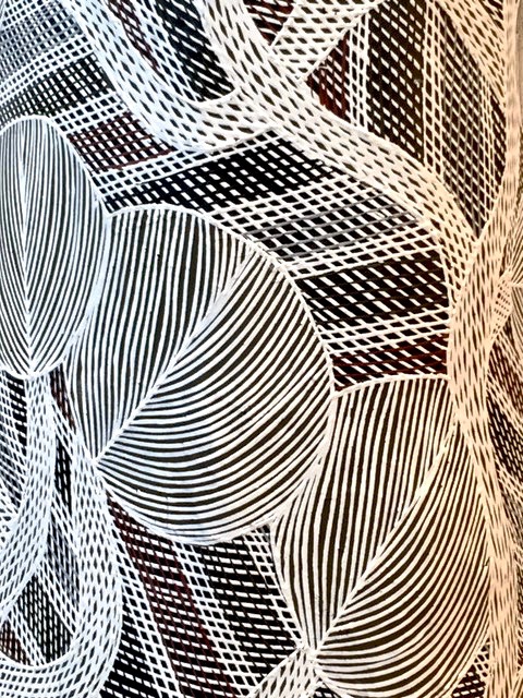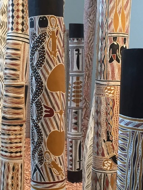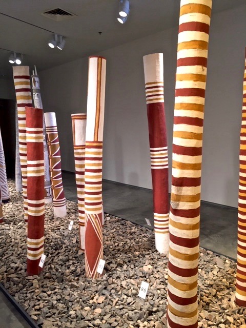 The next exhibit was “Contemporary Aboriginal Australian Memorial Poles”.  Traditionally, these poles marked the final point iin Aboriginal mortuary rites.  They signified the moment when the spirit of the deceased had finally returned home – when they had left all vestiges of the munday “outside” world, and bocome one with the “inside” world of the ancestral realm.  Today, these poles are made as works of art.